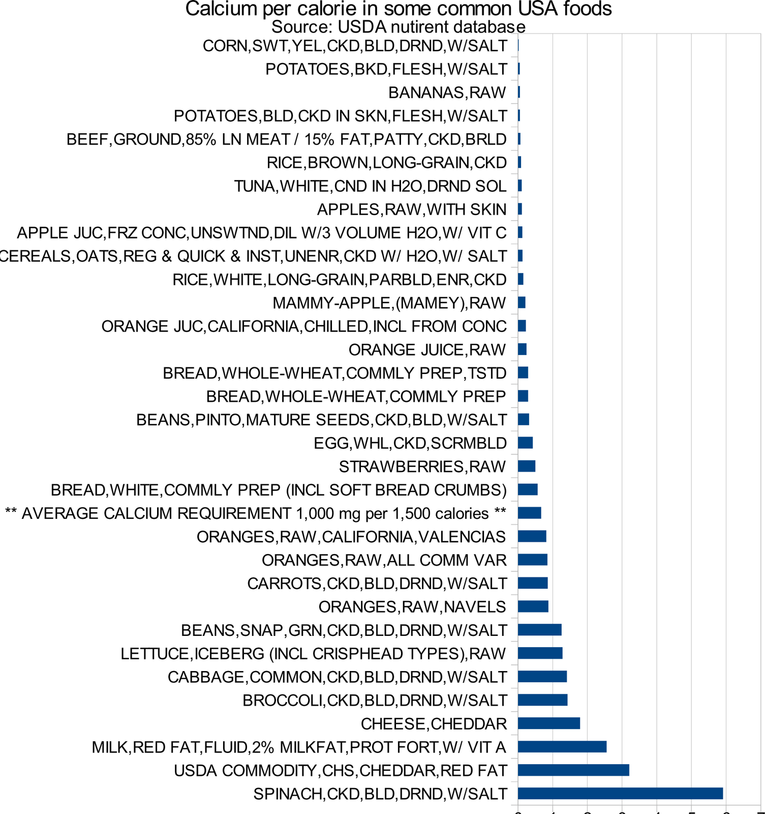 So in this post I'm doing a calorie-for-calorie calcium face-off. Other valuable tables could be created, but this post is only about getting your calcium in the caloric food you eat. And I'm only including in the first table foods I think are very common real foods in the USA For reference, you need around 1,000 mg of calcium and around 1,500 calories per day, so any food that supplies around 0.6 to 0.7 mg of calcium per calorie is a decent calcium supplier. Also, this just in on my radar: hard water can be a significant dietary calcium source.